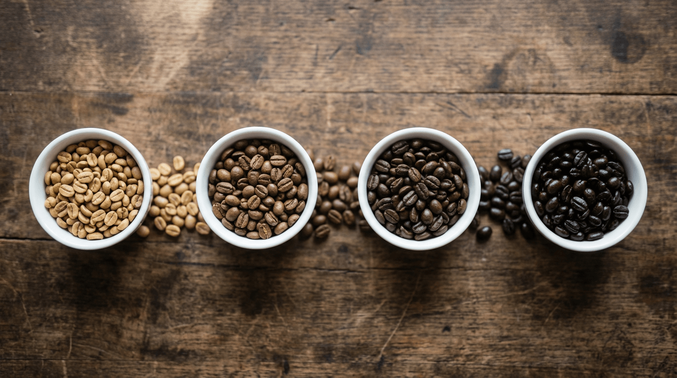 Learn all 4 coffee roast levels from light to dark with our visual chart. Compare flavors, temperatures, and acidity to find your perfect roast.