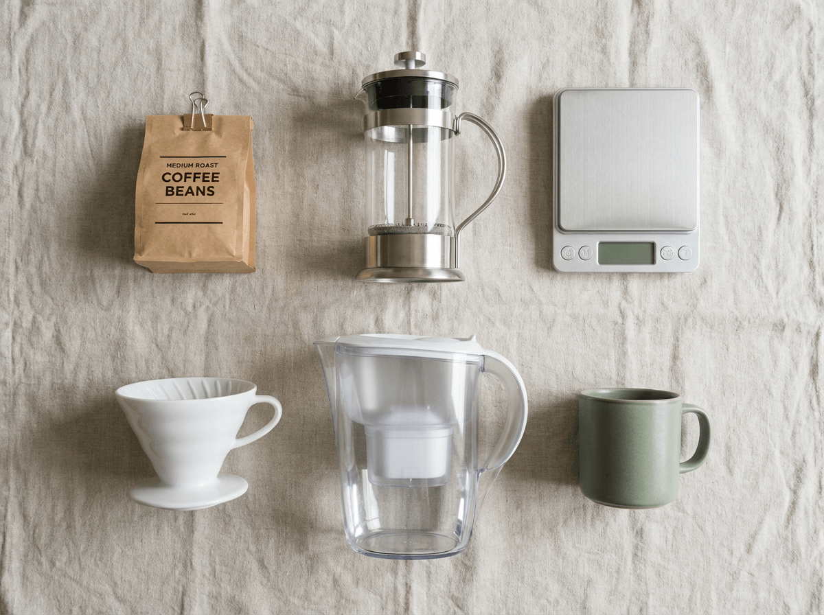 - ☐ Filtered water — Sounds fussy, but coffee is 98% water. A basic Brita pitcher improves taste noticeably.