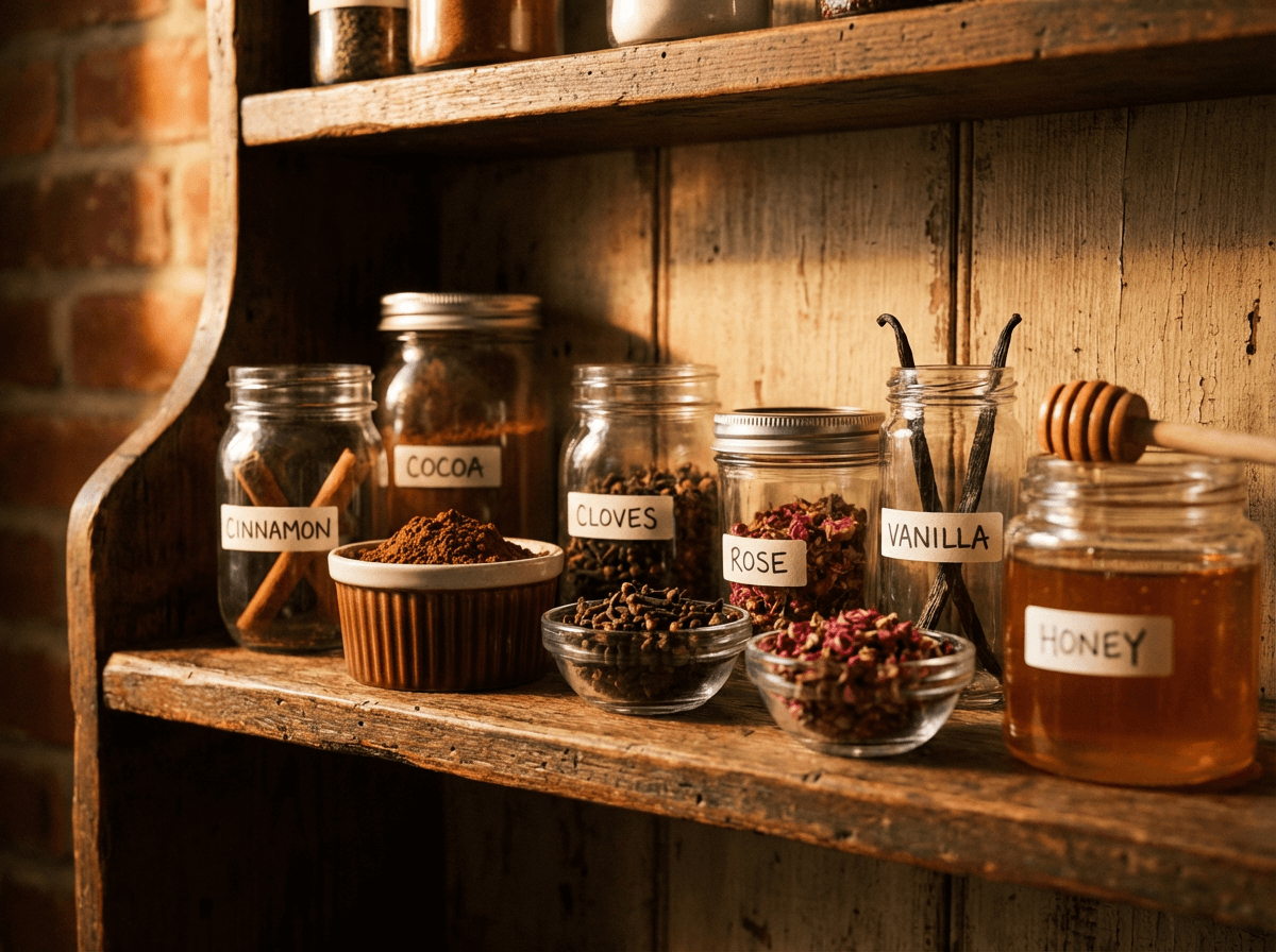 Open your kitchen cabinets and pull out: cinnamon, cocoa powder, honey, vanilla extract, dried herbs, black pepper, and any dried fruit you have. Smell each one deliberately, one at a time. Close your eyes. Focus on each aroma.